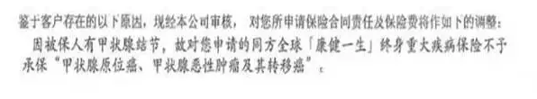 與上述排除條款相比,此類保險(xiǎn)公司對(duì)除外承保的表述是“公司不承銷/除XX及其轉(zhuǎn)讓或再發(fā)的保險(xiǎn)責(zé)任”,粗心客戶可能找不到這句話的漏洞但仔細(xì)看,你會(huì)發(fā)現(xiàn)它沒(méi)有明確說(shuō)明排除是否只是嚴(yán)重疾病的責(zé)任,而是使用保險(xiǎn)責(zé)任。但是,保險(xiǎn)責(zé)任一般包括輕癥責(zé)任,重大疾病責(zé)任和死亡責(zé)任(某些產(chǎn)品還包括終止責(zé)任、殘疾責(zé)任),因此當(dāng)您看到排除是保險(xiǎn)責(zé)任時(shí),十有八九也包括身故責(zé)任的除外。由上圖中的核保確定,經(jīng)過(guò)多保魚(yú)驗(yàn)證后,死亡責(zé)任也被排除在外。