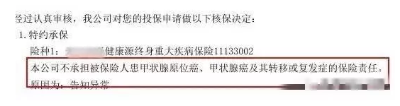 這是同方全球康健終身產(chǎn)品的除外承保的規(guī)定,上面的描述也很清楚,就是“甲狀腺原位癌,甲狀腺惡性腫瘤和轉(zhuǎn)移”不予承保,這就是甲狀腺原位延長(zhǎng)癌癥相關(guān)責(zé)任,即只要是由于甲狀腺癌,其他類型的癌癥不包括在內(nèi),但不排除死亡和傷殘責(zé)任。對(duì)于大多數(shù)保險(xiǎn)公司而言,這也是排除承保的正常處理方式。也許你會(huì)認(rèn)為這看起來(lái)有點(diǎn)“殘忍”,但至少你還可以彌補(bǔ)你的死亡!下面的這種才算得上是終極除外,快隨多保魚(yú)繼續(xù)往下看!