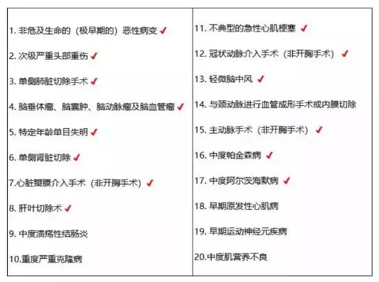 輕癥疾病保險:20種輕癥,保險金額的20%,責(zé)任在1次付款后終止。包含高原位癌原位輕度中風(fēng)、非典型心肌梗死、心臟支架手術(shù)、中度帕金森疾病、中度阿爾茨海默病等。