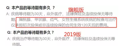 在常見(jiàn)問(wèn)答中,升級(jí)后的2019版不再對(duì)扁桃體、甲狀腺、疝氣、女性生殖系統(tǒng)疾病的檢查與治療設(shè)定理賠時(shí)間限制。