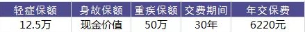 我們來舉個栗子便于理解:張先生今年30周歲,購買達(dá)爾文1號,重疾保險(xiǎn)金額50萬元,輕癥疾病保險(xiǎn)金額12.5萬元,交30年,保險(xiǎn)期間保至終身,每年繳納保費(fèi)6220元。