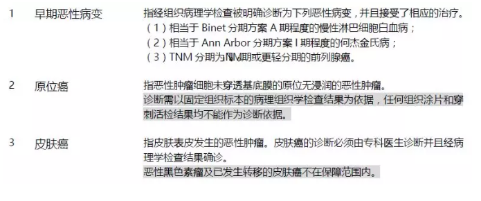 例如:“極早期惡性腫瘤或惡性病變”。大多數(shù)重疾險(xiǎn)的疾病定義如下: