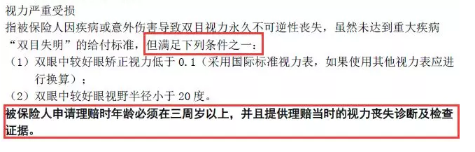 (要求被保險(xiǎn)人理賠時(shí)年齡在3周歲以上,我們一般不視為缺點(diǎn),因?yàn)?歲以前的小孩子因意外傷及眼睛的比較少,更多的為先天性視力疾?。?/p>