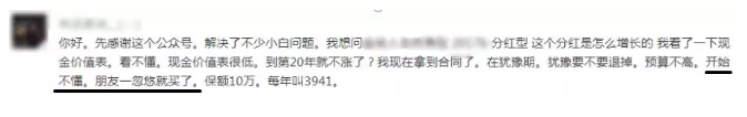 業(yè)務(wù)員:誰(shuí)家賺點(diǎn)錢都不容易,買個(gè)保險(xiǎn)沒(méi)生病錢不就白花了么?!這款產(chǎn)品的分紅很可觀,來(lái)我給你算一下看看……