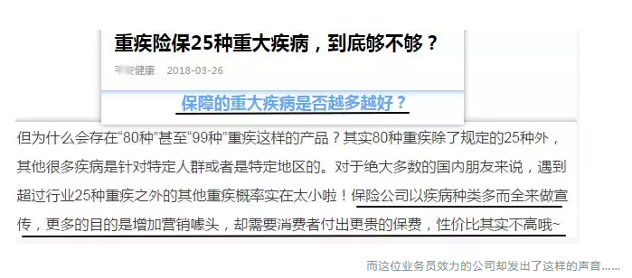 更別說(shuō)這位業(yè)務(wù)員自己公司的公眾號(hào)也曾發(fā)文稱:25種重大疾病就夠了。這些業(yè)務(wù)員朋友為了出單,連自己公司說(shuō)的話都不認(rèn)了??!