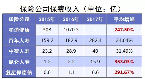 這兩家保險公司的年保費收入迅速增長,在2017年的時候,更是成倍增長。