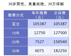 保障類的產(chǎn)品意在杠桿作用,用盡可能少的保費(fèi)投入,轉(zhuǎn)移盡可能大的風(fēng)險(xiǎn)。在收入穩(wěn)定的情況,選擇較長的時(shí)間的繳費(fèi)方式相當(dāng)于每年付出的小成本, 享受同等的高額保障。