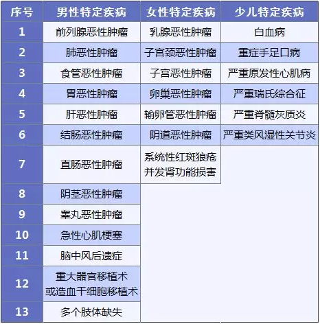 有三種:男性特定疾病、女性特定疾病、少兒特定疾病。我們來看一下具體都包含哪些疾?。?/p>
