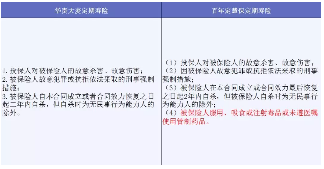 綜上,在責(zé)任免除方面,華貴大麥壽險(xiǎn)要比百年定慧保壽險(xiǎn)更有優(yōu)勢(shì)一些。