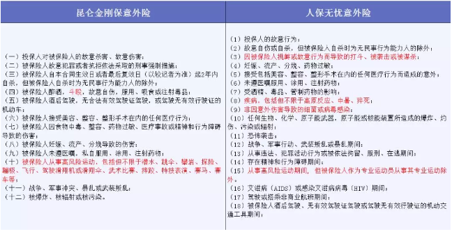 高風(fēng)險(xiǎn)運(yùn)動(dòng):人保無(wú)憂指明專業(yè)運(yùn)動(dòng)員或從事專業(yè)運(yùn)動(dòng)的除外,但沒(méi)有舉例一些常見(jiàn)的高風(fēng)險(xiǎn)運(yùn)動(dòng)名稱。昆侖金剛列舉了十幾個(gè)高風(fēng)險(xiǎn)運(yùn)動(dòng),但沒(méi)有將專業(yè)運(yùn)動(dòng)員排除在外,這一點(diǎn)兩款產(chǎn)品不相上下。