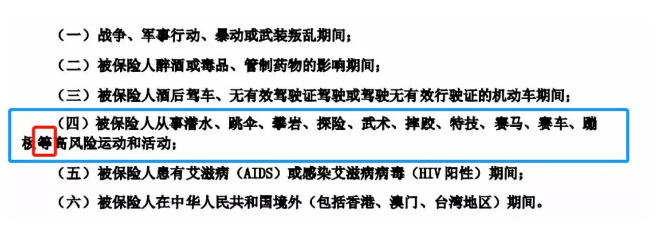 這是一條關(guān)于高風(fēng)險(xiǎn)運(yùn)動(dòng)的免責(zé),保魚(yú)君看過(guò)很多意外險(xiǎn)的保險(xiǎn)免責(zé)條款了,但對(duì)于“等”字都沒(méi)有一個(gè)明確的界定。