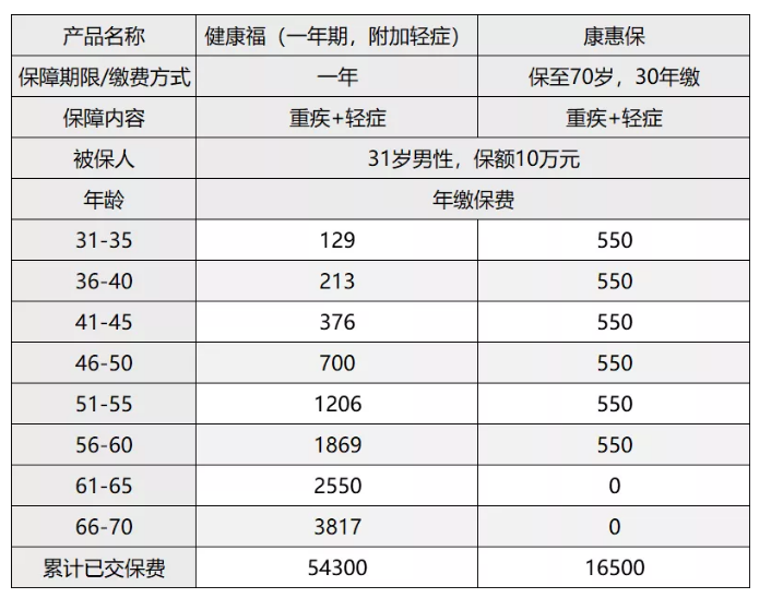 現(xiàn)在來看看直觀的對比,以下是健康福(一年期)和百年康惠保年繳保費對比: