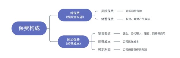 保費(fèi)=風(fēng)險(xiǎn)保費(fèi)+儲(chǔ)蓄保費(fèi)+銷售渠道費(fèi)用+運(yùn)營(yíng)成本+預(yù)定利潤(rùn)。
