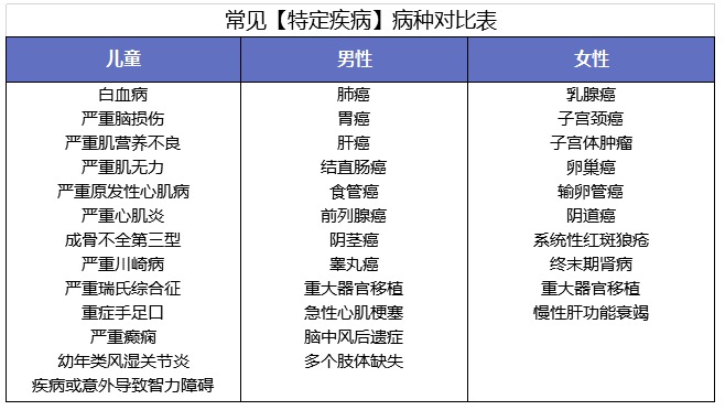 常見的特定疾病病種有下面這些,不同的產(chǎn)品可能會(huì)有所差異: