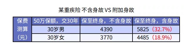 你看,30歲男性50萬保額,交30年保至終身,附加身故責(zé)任后保費(fèi)貴了32.7%。