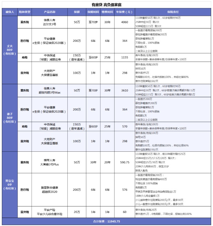 但不一樣的是,這個家庭高負債,現(xiàn)金流緊張,所以在保費預算上,咱就不能再死板的按“年收入的10%”計算,應該適當下調(diào)。