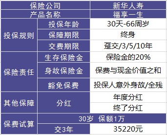 按男性 30歲,繳費3年,每年保額1萬來算,則猶豫期10天后、30歲-終身每年能領(lǐng)到2000元+20%累計紅利生存金。