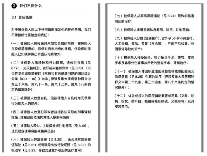 不保什么,也就是責(zé)任免除,看了下和大多數(shù)普通的百萬醫(yī)療險相似,中規(guī)中矩。我們要特別記得的是既往癥和先天性及遺傳性疾病是不保的。