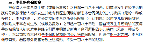 評(píng)論:估計(jì)為了使產(chǎn)品更具競(jìng)爭(zhēng)力,該產(chǎn)品的精算師特別推出了“兒童疾病”的概念。事實(shí)上,這很奇怪。由于它被稱(chēng)為康寧兒童的疾病,為什么我們要特別定義關(guān)于兒童疾病的部分?