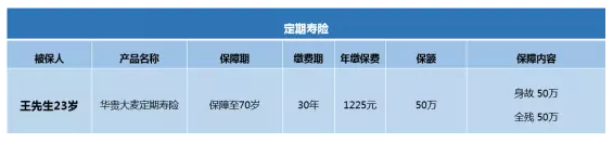 壽險,精算師列出的產(chǎn)品可以說是非常劃算的,50萬保額,每年支付保費1225元,支付30年,支付期限長,減少了保費的年度壓力。