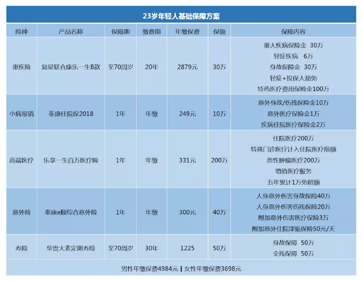 我們剛剛進入社會,可支配資金不足,不建議留下醫(yī)療風(fēng)險,并分配醫(yī)療保險來轉(zhuǎn)移醫(yī)療風(fēng)險。在醫(yī)療保險方面,主要考慮因素是免賠額鯤報銷范圍和報銷比例。