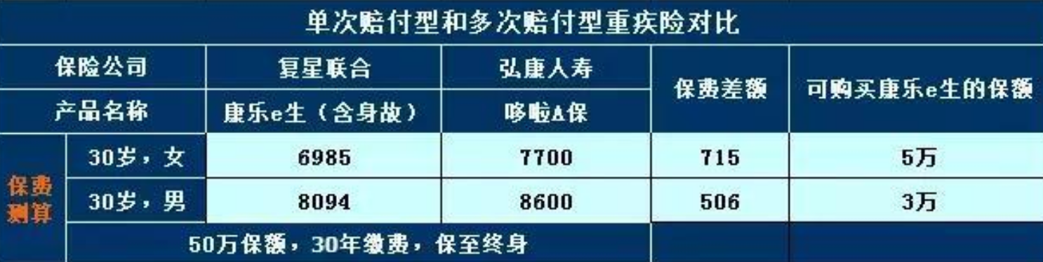 首先,我們比較一下。單個賠付嚴重疾病以復(fù)星聯(lián)合康樂e生為例子,多次賠付嚴重疾病是弘康哆啦A保為例。讓我們對比一下,看看兩種產(chǎn)品之間的區(qū)別。