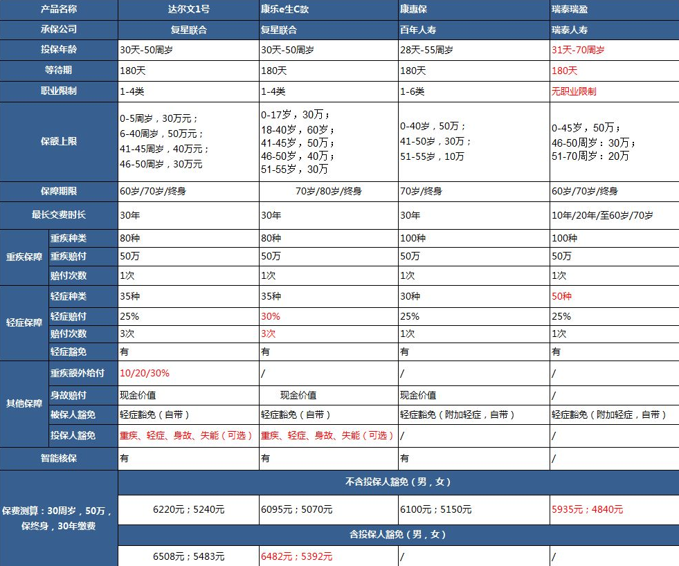 為了便于比較,多保魚(yú)把達(dá)爾文1號(hào)、百年康惠保、 瑞泰瑞盈和復(fù)星聯(lián)合康樂(lè)e生中進(jìn)行了比較: