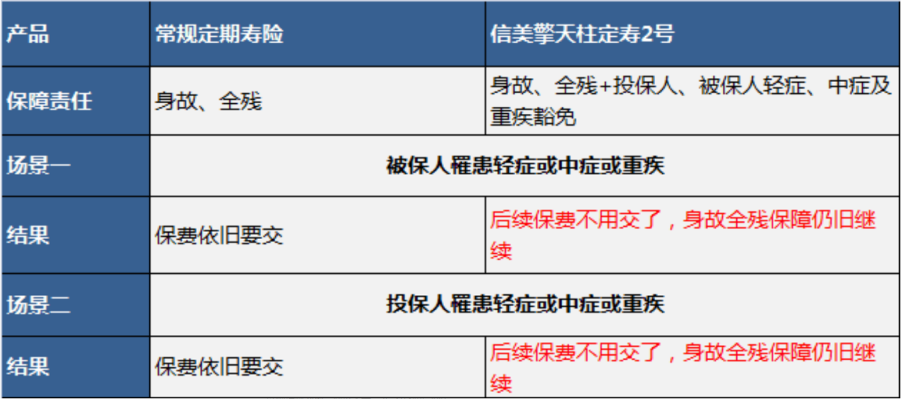 這也是該產(chǎn)品的最大亮點(diǎn)。這應(yīng)該是業(yè)內(nèi)第一次將重大疾病保險(xiǎn)的常見“保險(xiǎn)費(fèi)用豁免”功能移植到定期壽險(xiǎn)。必須說信美人壽還是很有意思的。
