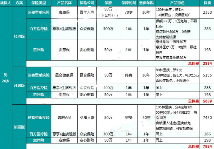 不同年輕人的家庭背景、消費(fèi)習(xí)慣不同的,預(yù)算有高低,所以設(shè)計(jì)了三種保險組合。
