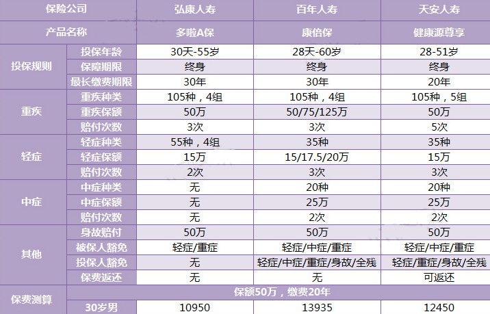 (3)如果追求高性?xún)r(jià)比:百年人壽康倍保保費(fèi)是最貴的,但它高于天安人壽健康源,在第二次、三次輕癥和重病賠付比例是更高;弘康多啦A保最便宜,最重要的原因是它沒(méi)有中癥保障,遵循廉價(jià)的、足夠的邏輯,無(wú)論如何比較,從保費(fèi)開(kāi)支都是這里最低的。