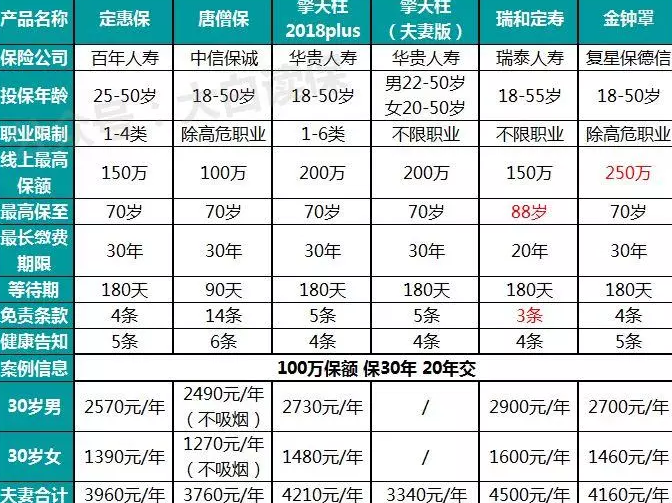 那保費(fèi)到底能相差多少呢?多保魚選擇了6款市面上主流的定壽進(jìn)行對(duì)比: