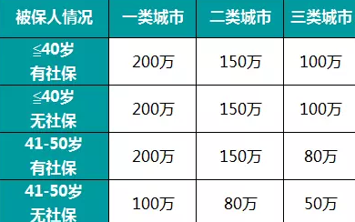 但并非所有人都可以購買200萬保額,被保人年齡、所在城市、社保繳納情況對(duì)保額產(chǎn)生影響。詳情如下所示: