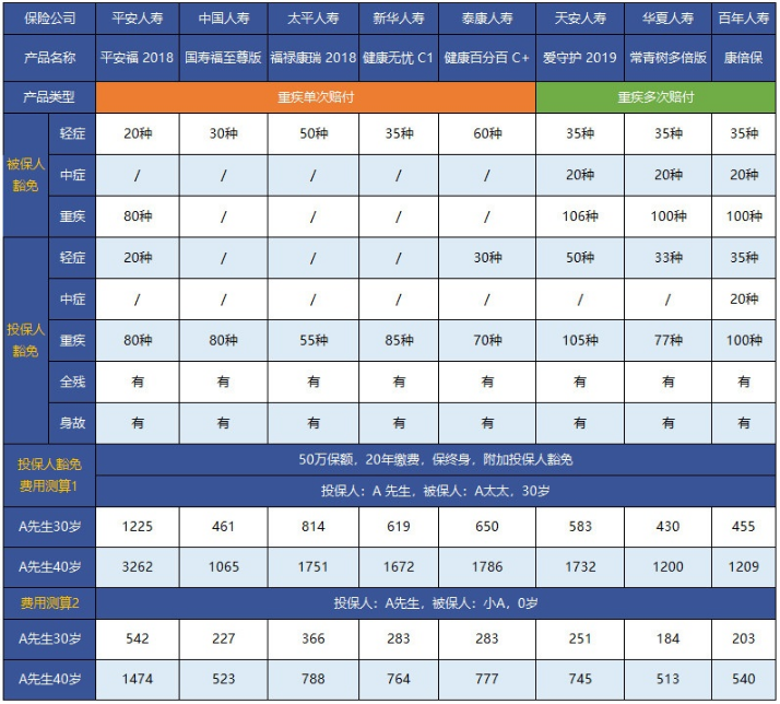 綜上,不同產(chǎn)品的保費(fèi)豁免條件都是不一樣的,在費(fèi)用差不多的情況下,肯定是選擇豁免種類越多越好,重疾多次賠付優(yōu)于單次賠付。上圖不難看出,重疾險(xiǎn)產(chǎn)品都是涵蓋被保險(xiǎn)人豁免的,所以,基本上只需要附加投保人豁免就可以了,如果多了投保人豁免但是保費(fèi)也增加了很多,實(shí)際上還是不建議選擇的。