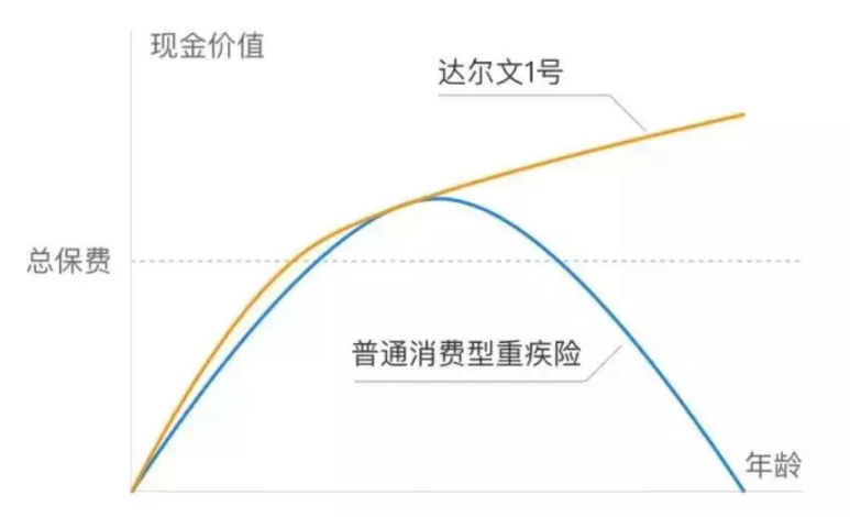 一般消費類型的重大疾病保險的現(xiàn)金價值是第先高后低的趨勢,但達(dá)爾文1號的現(xiàn)金價值隨著年齡的增長而增加,并且可以返回保額的95%。用消費型的價格購買返還類型的價值。