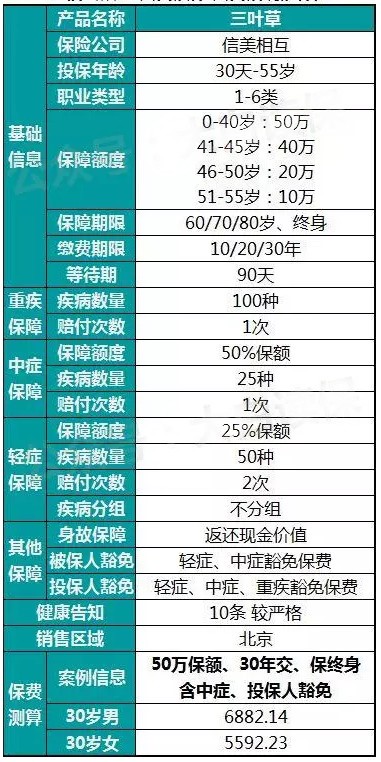 與舊版本康惠保相比,三葉草增加了中癥保障,輕癥賠付也從1次變?yōu)?次,整體保障增強(qiáng)了不少,但價(jià)格并不貴得多,特別是30歲女性,500,000保額、30年交,、保證到70歲,三葉草比每年比康惠保貴8元,這是非常劃算的。