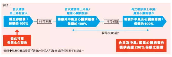 就首次因嚴重程度2或3之危疾已付或應付生存賠償后,第一次從診斷日期開始的基本計劃的保費將永久為豁免,并且被保險人可以免費享受保障至保單終止。