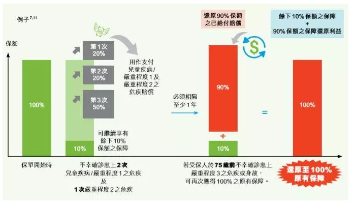 7.在理賠之后可以恢復高達90%的保額,并且可以再次獲得高達100%的原始保障