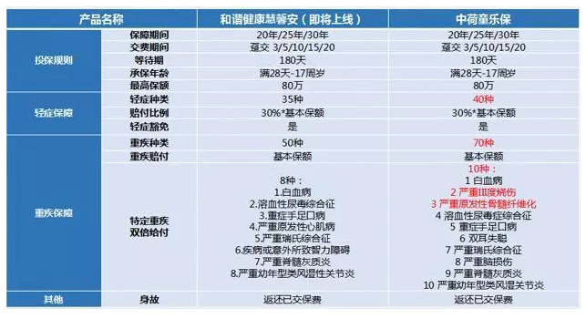 1.我們可以看出這兩個(gè)產(chǎn)品都在保障責(zé)任結(jié)構(gòu)和基本信息如支付期,等待期,保障期等都是一樣的,中荷童樂(lè)保重疾種類 70例,輕癥40種,特定疾病10種都多過(guò)慧馨安。