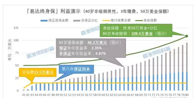 「易達(dá)終身?!棺鳛橐豢罱K身壽險,與相同的保費(fèi)可以移動壽險保額在同類產(chǎn)品中具有明顯的優(yōu)勢。與大陸產(chǎn)品相比,被稱為“內(nèi)地最具成本效益的終身壽險橫琴“優(yōu)愛寶””,很容易被「易達(dá)終身?!箵魯?。與香港產(chǎn)品相比,例如,一名29歲(30歲)非吸煙男性為例,對于保費(fèi)壽險而言,5年年繳保費(fèi)的為38,755美元,以及「易達(dá)終身?!箍梢蕴峁┍n~的死亡。 836,000美元,而保誠的理想人生僅提供 500,000美元,而「易達(dá)終身?!固峁└叩谋WC收益率和預(yù)期回報。