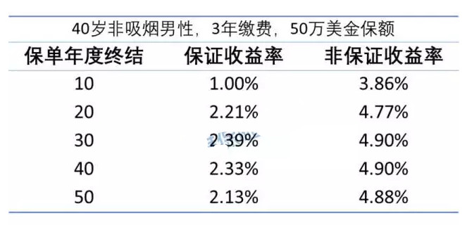 此外,上述收益沒有考慮到500,000美元壽險保額的風(fēng)險和成本。通常,我們購買的純儲蓄產(chǎn)品都沒有死亡保障(即死亡補(bǔ)償=累計(jì)保費(fèi))。除了提供節(jié)省之外,「易達(dá)終身保」還提供了500,000美元的終身死亡保障,這相當(dāng)于將保險人節(jié)省了一份定期壽險的保費(fèi),而這部分成本也應(yīng)該包含在我們的保單收入中。如果我們將600,000美元的保額、20年平均值保費(fèi)定期壽險添加到保單,則定期壽險每年消耗905美元保費(fèi),即總保費(fèi)155,000美元的0.58%(= 905 / 155,000),這相當(dāng)于產(chǎn)品的真正的保證收益率與非保證產(chǎn)量將增加至少0.58%(用“至少”一詞表示,是考慮到產(chǎn)品提供的終身壽險值超過定期壽險)。