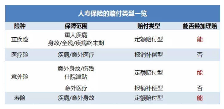 從上表中可以清楚地看出,如果投保多個保險,則定額賠付類型的保險可以與理賠疊加,而報銷補償保險不能與理賠疊加。