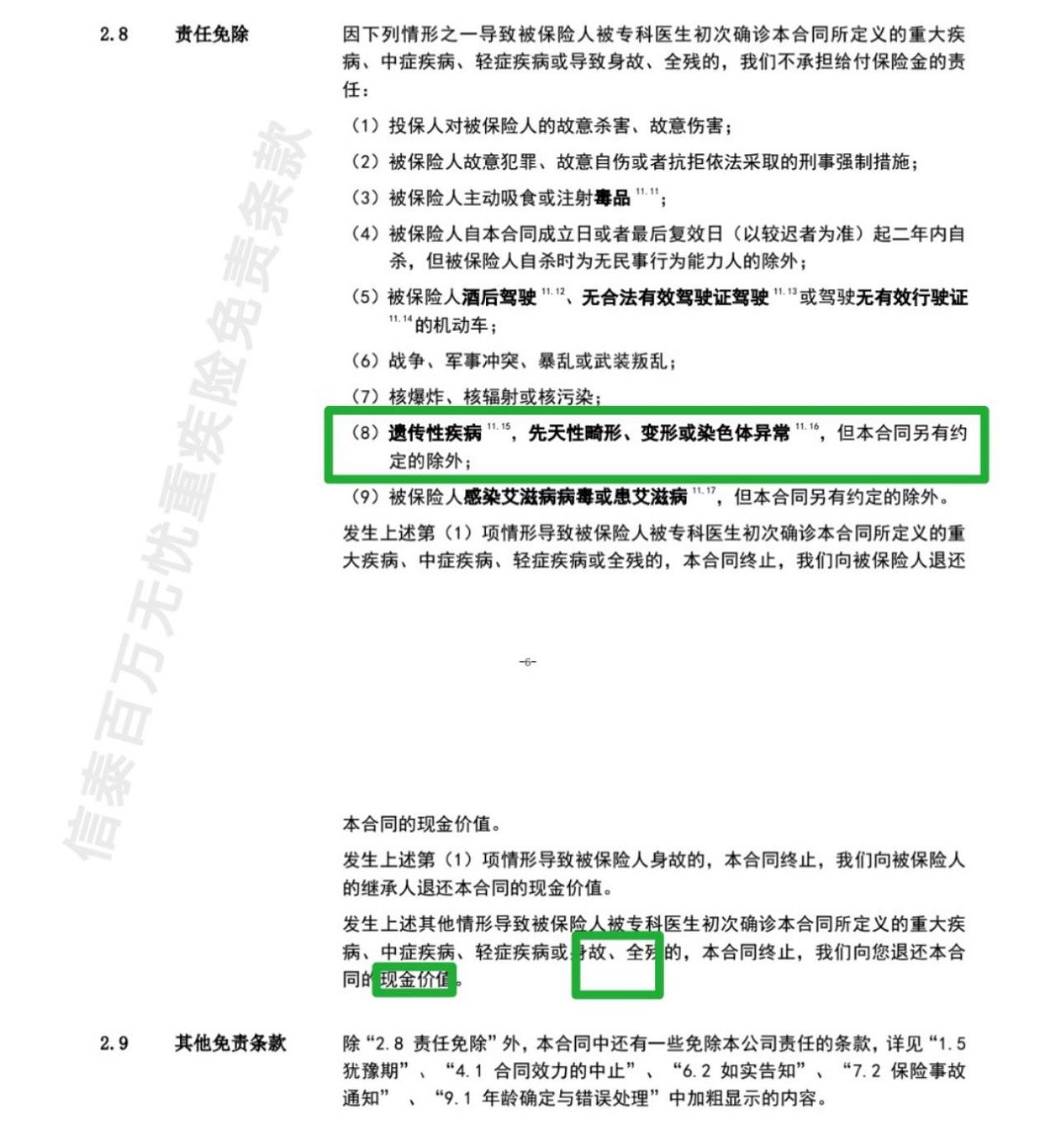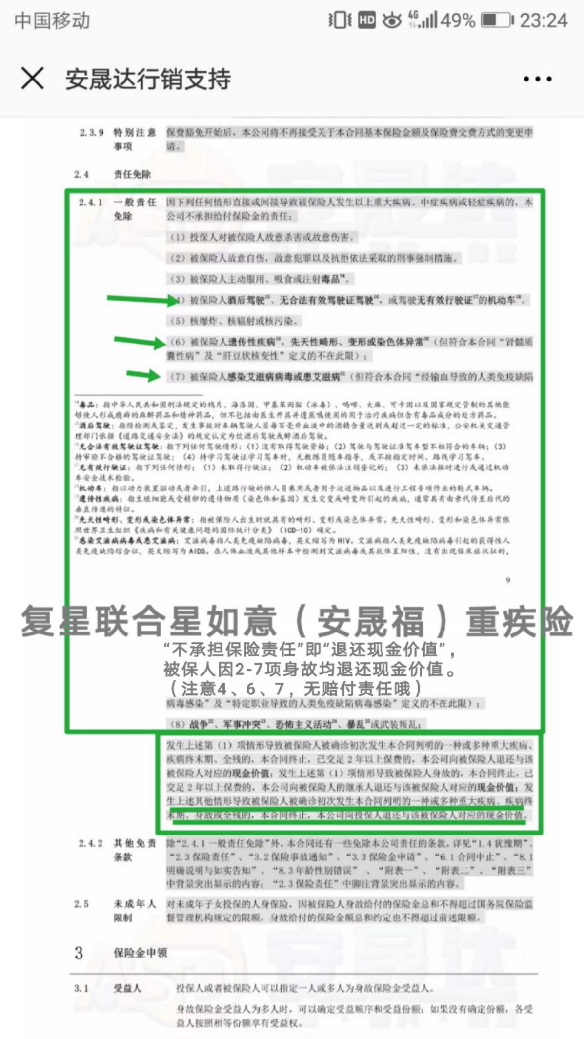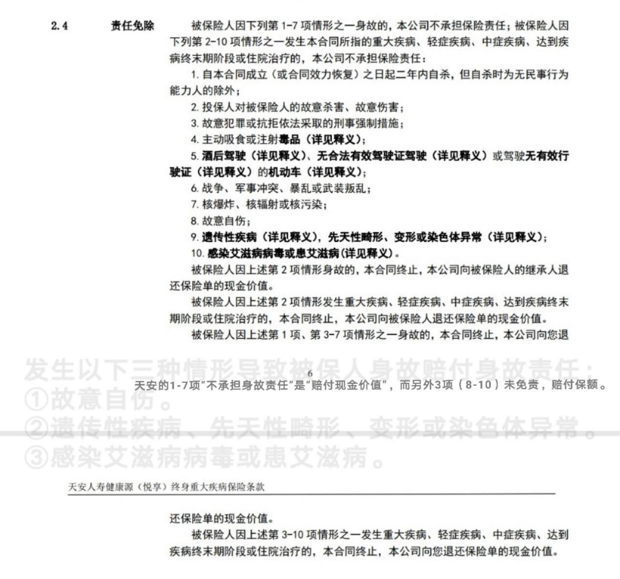 天安健康源悅享,“酒駕”、“吸毒”、“核爆炸”、“戰(zhàn)爭”、“二年內(nèi)自殺”等等情況沒有身故賠付責(zé)任(僅退還現(xiàn)金價(jià)值),而“故意自傷”、“感染艾滋病病毒”、“遺傳性疾病”等等情況是可以得到身故賠付的(按保額)。