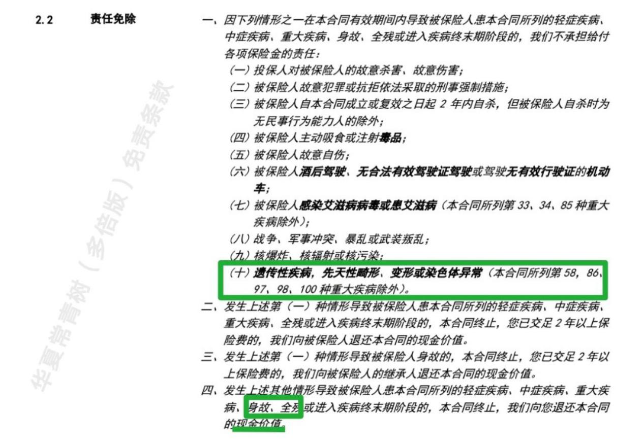 華夏常青樹多倍版,被保人“故意自傷”、“酒駕”、“感染艾滋病病毒”、“遺傳性疾病”等均不能得到身故賠付(僅退還現(xiàn)金價(jià)值)。