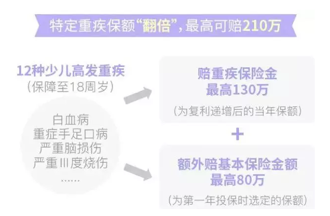 ①12種兒童高發(fā)重病本身也屬于重病類,因此保險公司將在確診疾病時直接支付重大疾病保險費(即年復(fù)利增加后的保額)