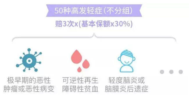 3、基本保障扎實:100種重病+ 50種輕癥,輕癥可不分組賠付3次。