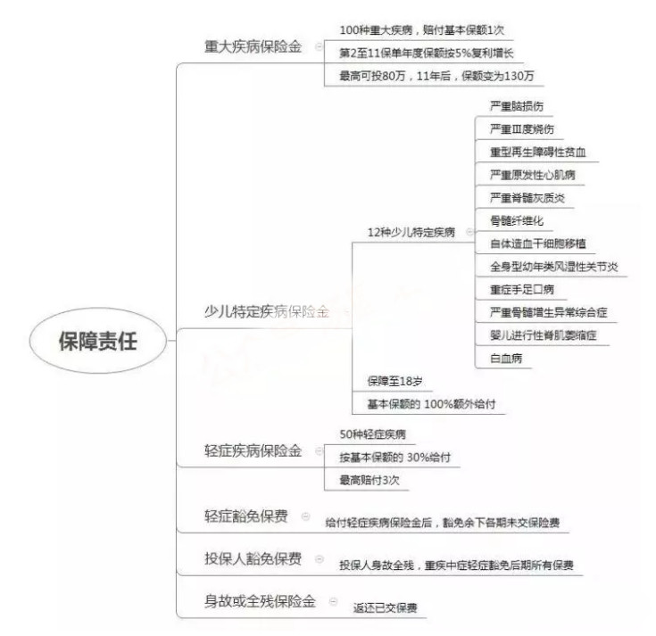 “大黃蜂2號”保障的責任非常全面,包括重大疾病、兒童的特定疾病、輕癥疾病、輕癥豁免、保單持有人豁免和死亡全部禁用保障責任。