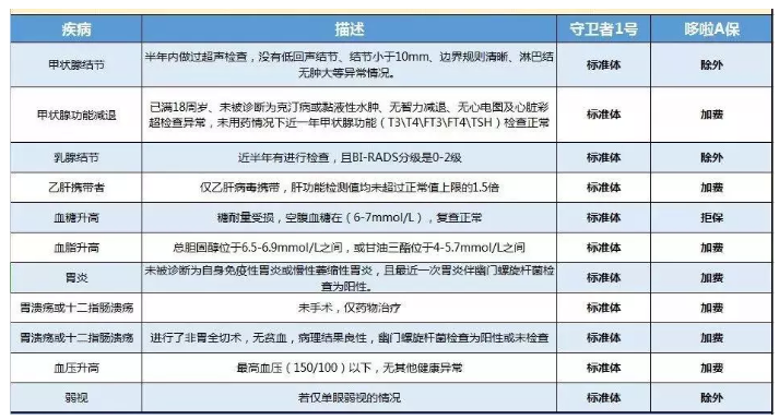 豁免保障 +智能核保 +預(yù)核保在豁免保障,守衛(wèi)者1號(hào)可選保險(xiǎn)豁免,輕癥 / 中癥 / 重疾 /死亡/總殘疾,可以保護(hù)所有,說(shuō)360°無(wú)死角。雖然,保障責(zé)任不包含中癥保障,但已經(jīng)在保險(xiǎn)豁免條款中達(dá)成一致,一旦遭遇20種中癥疾病,豁免后期保費(fèi)。真棒!但是,應(yīng)該注意的是,被保險(xiǎn)人豁免暫時(shí)只對(duì)未成年人開(kāi)放,也就是說(shuō),只有父母可以為孩子投保,如果他們想要互相保護(hù),他們必須等待。讓我們來(lái)談?wù)勊闹悄芎吮?,守衛(wèi)者1號(hào)的智能核保相對(duì)寬松。如果身體有小問(wèn)題,如甲狀腺結(jié)節(jié)、乳腺結(jié)節(jié)、乙型肝炎攜帶者,即使是輕微的三高人口也可以正常購(gòu)買(mǎi)。