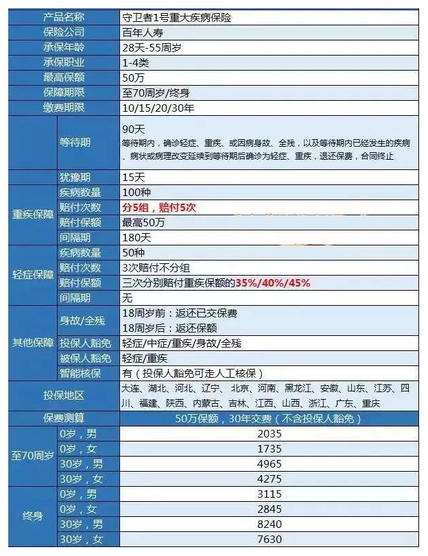 百年人壽守衛(wèi)者1號重疾險保障內容分析