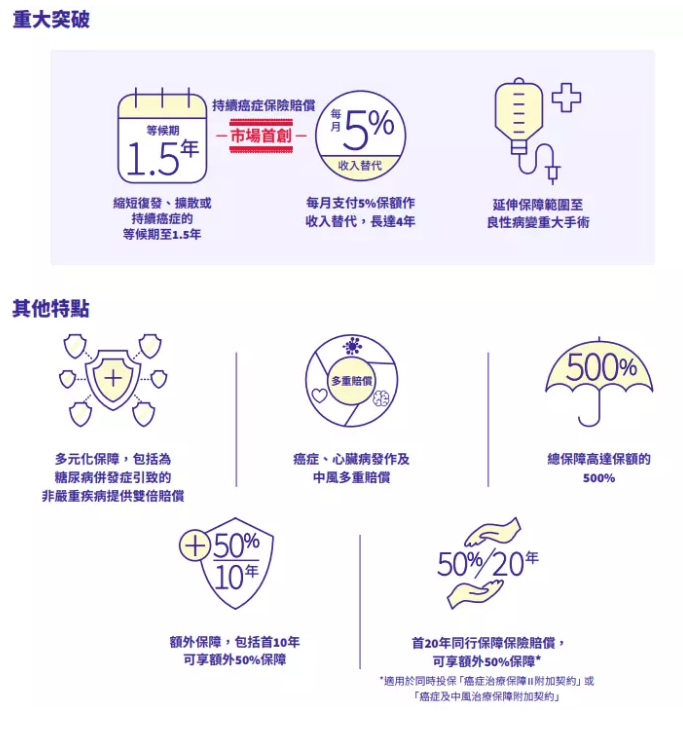 總體來說,“愛護(hù)同行”是一種非常好的重大疾病保險產(chǎn)品,它結(jié)合了當(dāng)前香港保險市場在重大疾病保險中的主要優(yōu)勢,同時實現(xiàn)了一定的突破性創(chuàng)新,將癌癥多次賠付的間隔從3年進(jìn)一步減少到1.5年。對于被保險人更為實用,并且可以為癌癥患者在抗癌道路上提供長期的、治療補(bǔ)償。