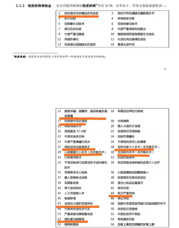 我們知道所有重大疾病保險包括銀保監(jiān)會規(guī)定的25種規(guī)定,基本覆蓋95%的發(fā)病率嚴(yán)重的疾病,所以嚴(yán)重疾病的升級沒有多大實際意義,但每個家庭可以自由地玩輕癥。雙重保護(hù)包括56種輕癥,市場上很少有超過56種輕癥。輕癥例如非典型心肌梗死、輕度中風(fēng)后遺癥、冠狀動脈介入手術(shù)和微創(chuàng)手術(shù)及其他非胸腔開腹手術(shù),包括冠狀動脈介入和微創(chuàng)搭橋,均為輕癥,其中包括重癥疾病產(chǎn)品在市場上并不常見,要么缺失一個,要么兩個一起缺失,而輕癥3額外的30%保額賠付,每個賠付沒有間隔期,是目前市場上最好的版本輕癥保障。